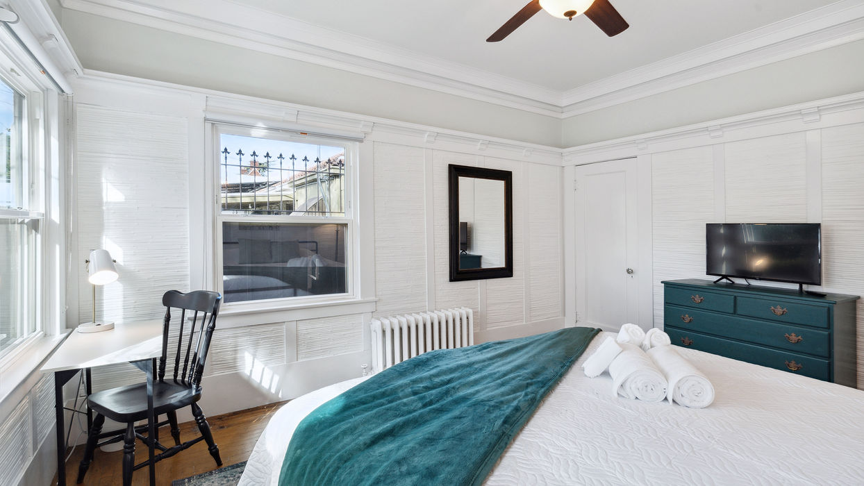 Welcome to The Bamboo at Bours Beauty. Enjoy this first story spacious room with shared full bath and half bath. The room has a California King with comfy memory foam mattresses and a dedicated workspace. The bedrooms has a ceiling fan, sleep machines and blackout shades to help ensure a restful environment. The bedroom includes a smart 32 inch TV for your private enjoyment. The home's thoughtful layout ensures privacy and comfort for all occupants.